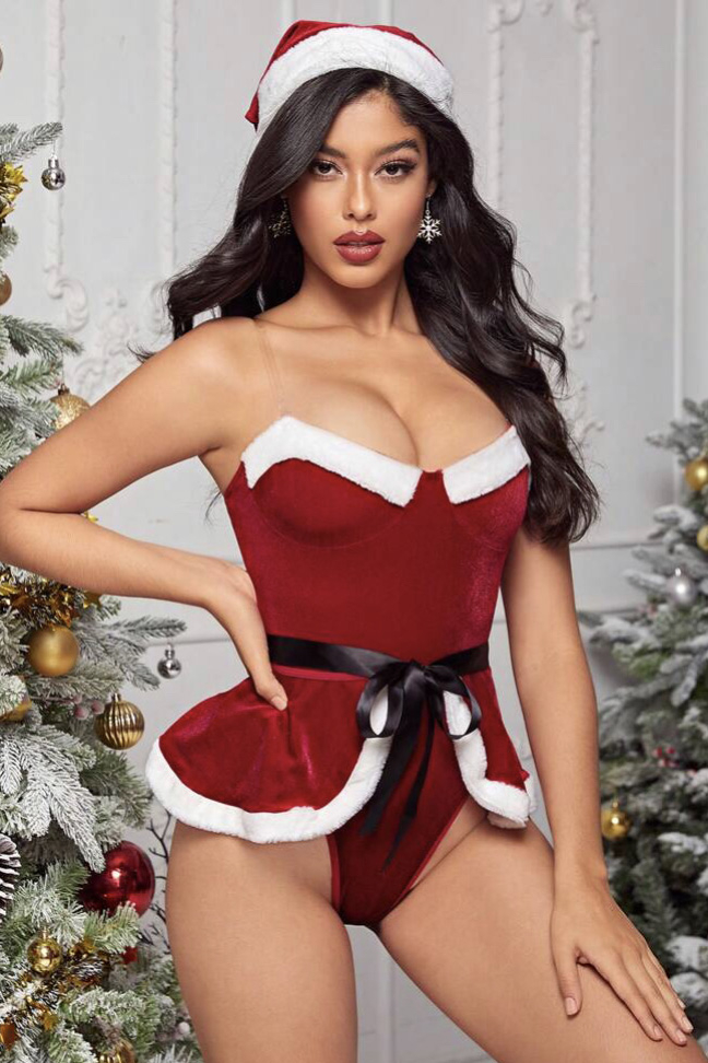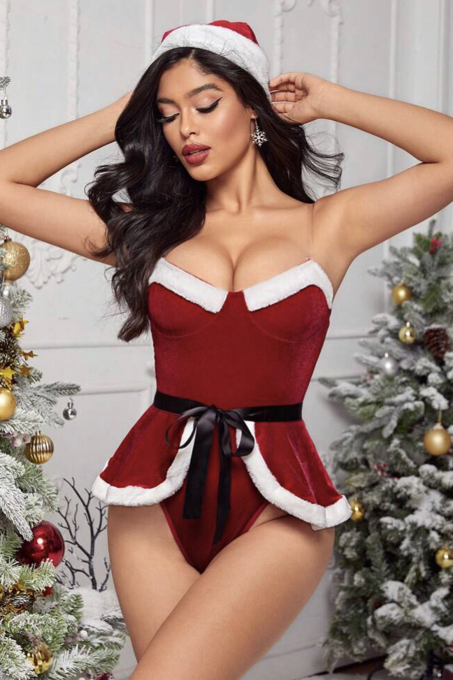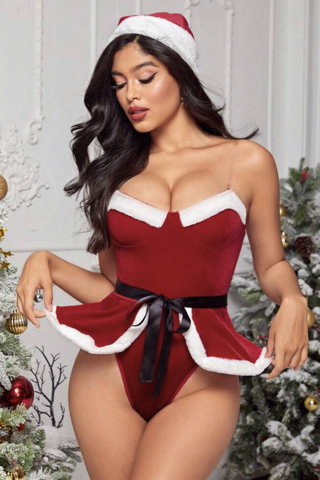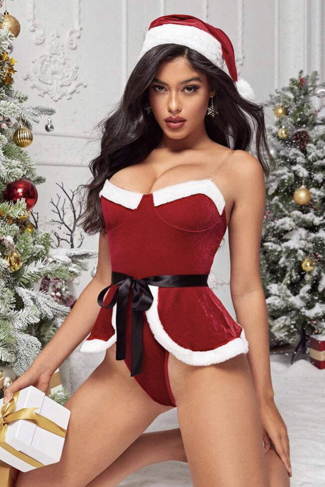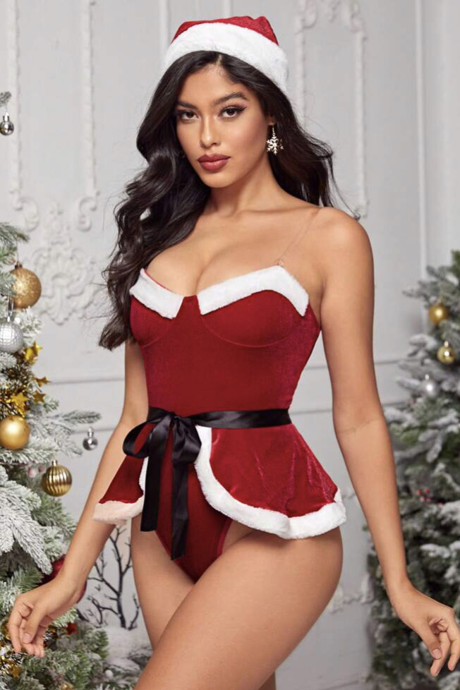 Set lenjerie intima din catifea,  format din 3 piese: body, caciula si accesoriu pentru talie.